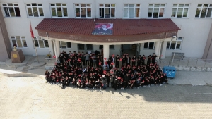 Yenice ilçesine bağlı Yortan Beldesindeki Çok Programlı Anadolu Lisesi öğrencileri ve öğretmenleri “100. Yıl” yazılı koreografı oluşturdu.