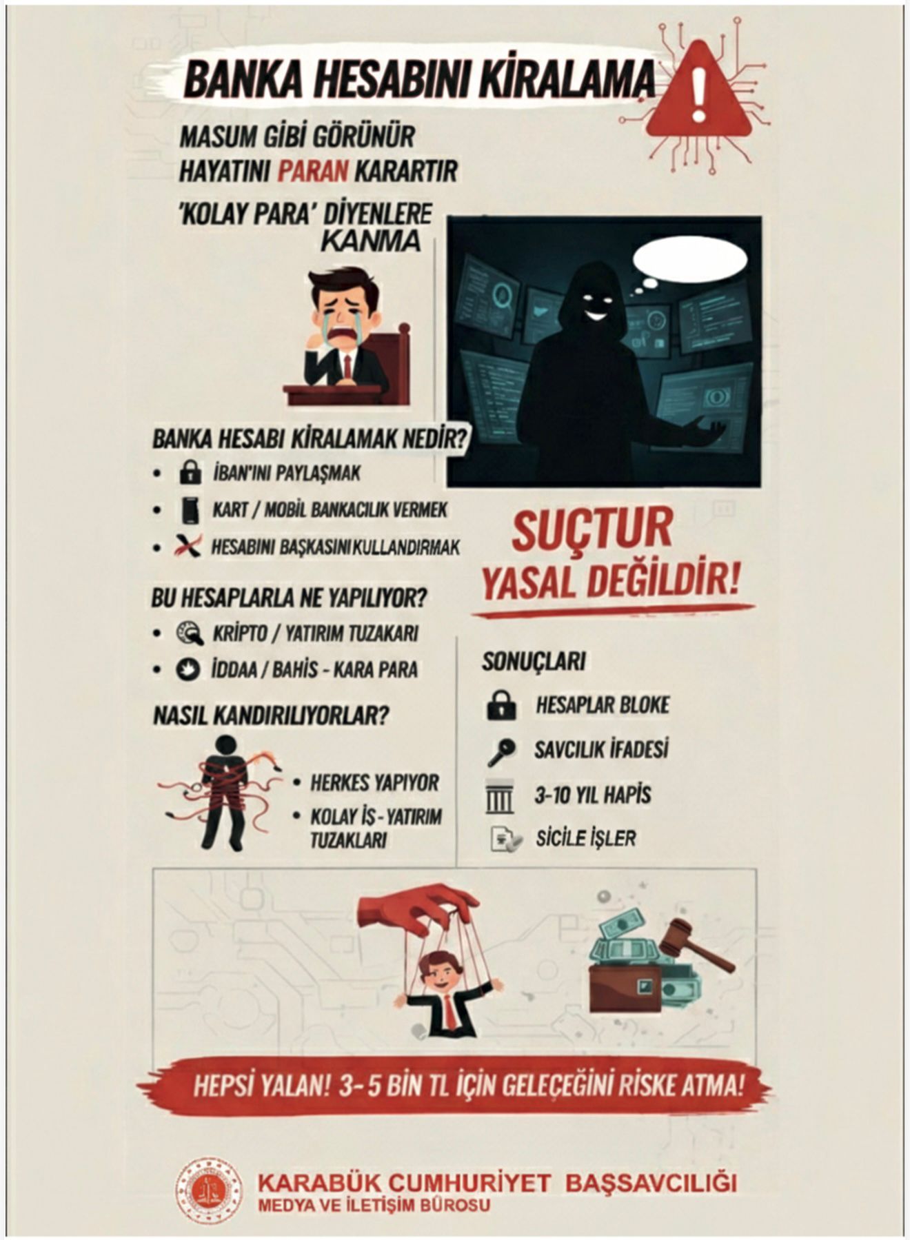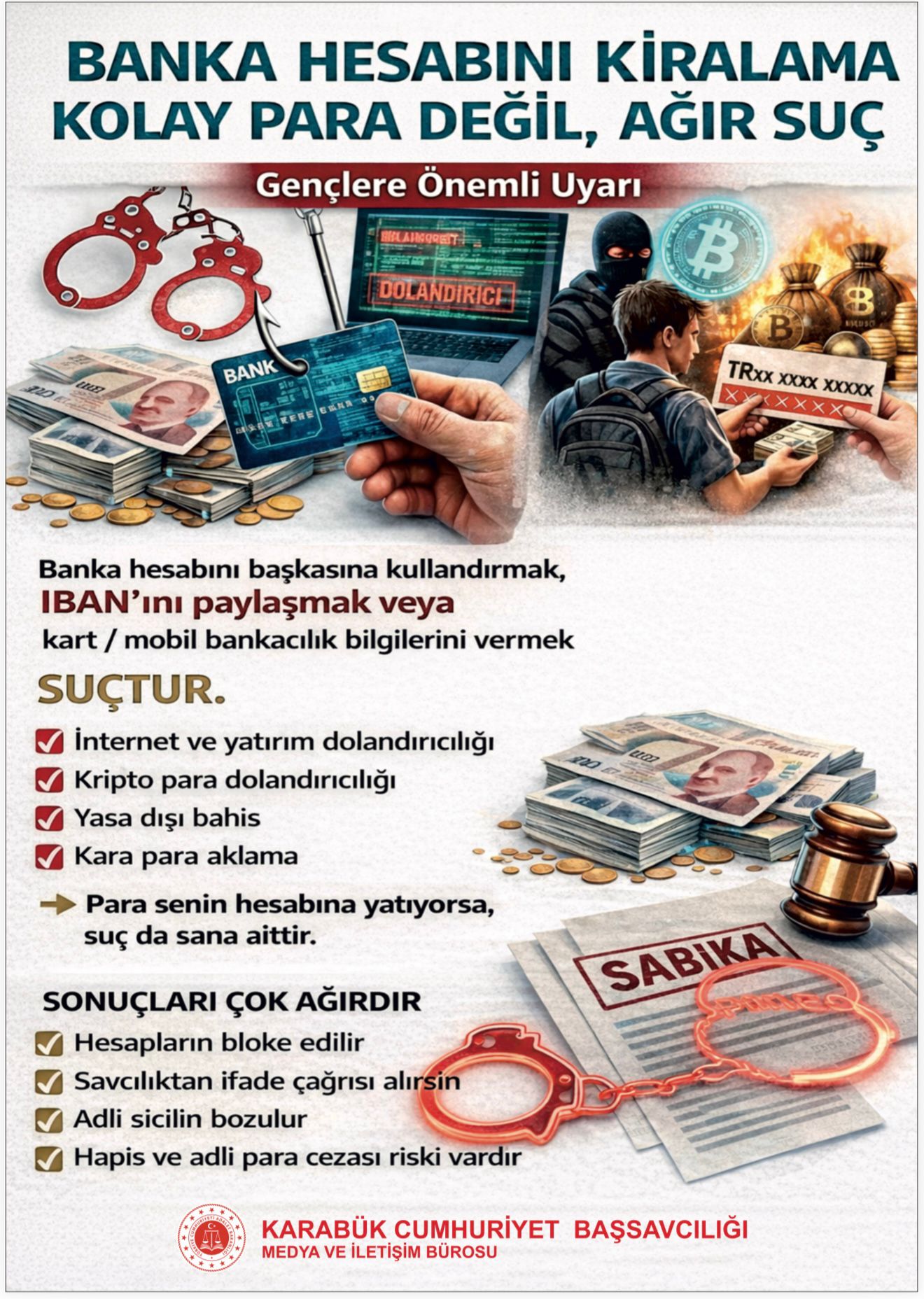 Son dönemde artış gösteren dolandırıcılık olaylarında, çocuklar adına açılan banka hesaplarının (IBAN) yasa dışı bahis, kumar ve çeşitli bilişim suçlarında kullanıldığı tespit edildi. Bu riskin önüne geçilmesi amacıyla Karabük Cumhuriyet Başsavcılığı tarafından önleyici ve bilinçlendirici bir çalışma yürütülüyor.